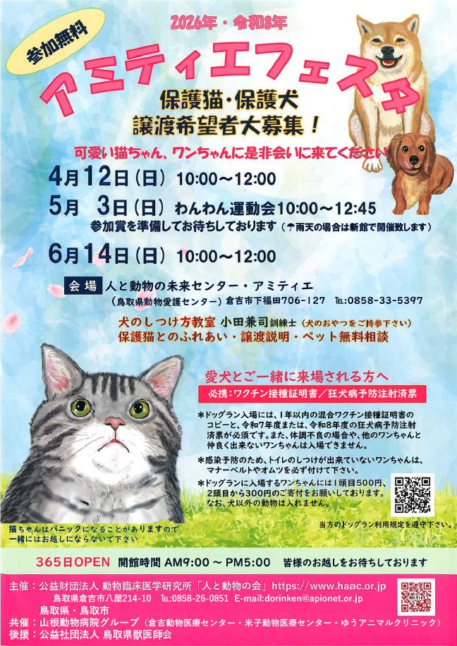 「人と動物の未来センター・アミティエ」(鳥取県動物愛護センター)で、4月12日(日)、5月3日(日)、6月14日(日)にアミティエフェスタを開催します。犬のしつけ方教室のほか、保護猫とのふれあいや譲渡説明なども随時対応します。ぜひお出かけください。