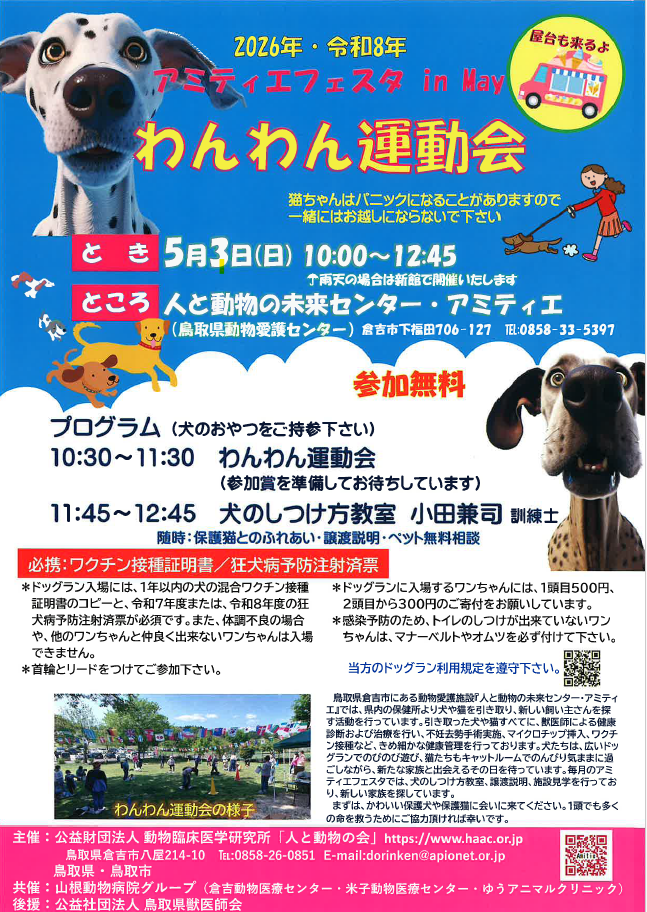 「人と動物の未来センター・アミティエ」(鳥取県動物愛護センター)で、5月3日(日)にアミティエフェスタ わんわん運動会を開催します。犬のしつけ方教室のほか、保護猫とのふれあいや譲渡説明なども随時対応します。ぜひお出かけください。